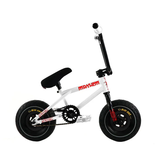 The Mayhem Riot Mini BMX 10″ Bike is designed for riders seeking extra durability and strength with its exclusive frame design. The bars are securely locked with a top-load stem, allowing for easy adjustments, while the 6-ply tires and open-hole wheel-set provide a lighter ride. The integrated seat clamp ensures better security when you’re out busting tricks, and the Kevlar saddle adds an extra layer of comfort and durability.